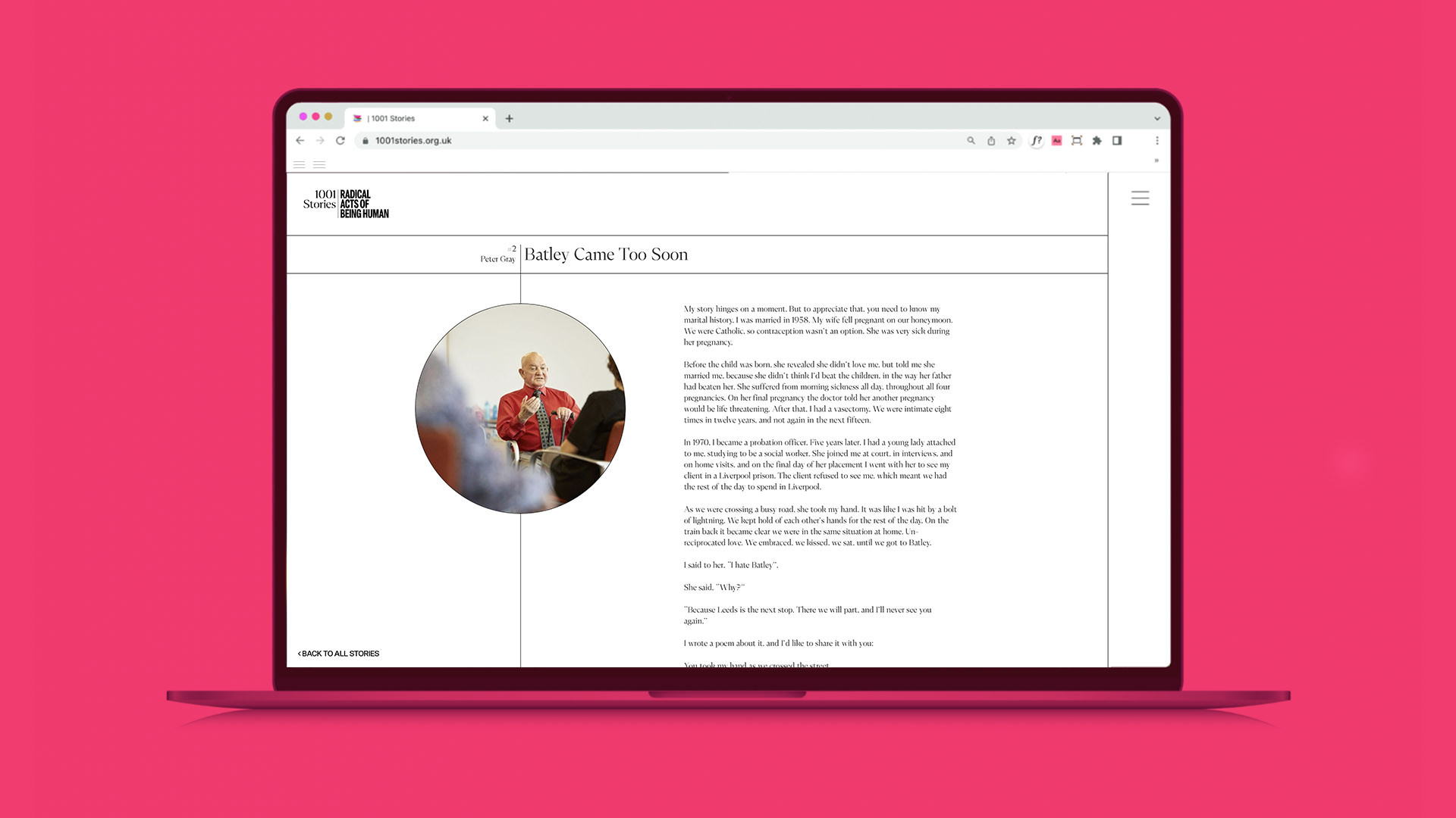The website aspect of the project is a self-contained experience that celebrates the stories in more detail, acting as a platform to host 1001 individual anecdotes and tales. The development of the digital archive allowed for chance encounters, whilst still maintaining a taxonomic approach to the structure and themes surrounding the individual stories. Accessibility – especially surrounding visual or motor skills – was particularly important when designing the website, due to the target audience and broad demographic of potential users. This led to a two threaded approach to the navigation of the digital archive: one would focus on an exploratory experience, encouraging the user to look around a space, reminiscent of the physical space of the exhibition and to find their way through themes to a curated selection of stories; the other would present all 1001 stories (and beyond) in a more traditional text format.