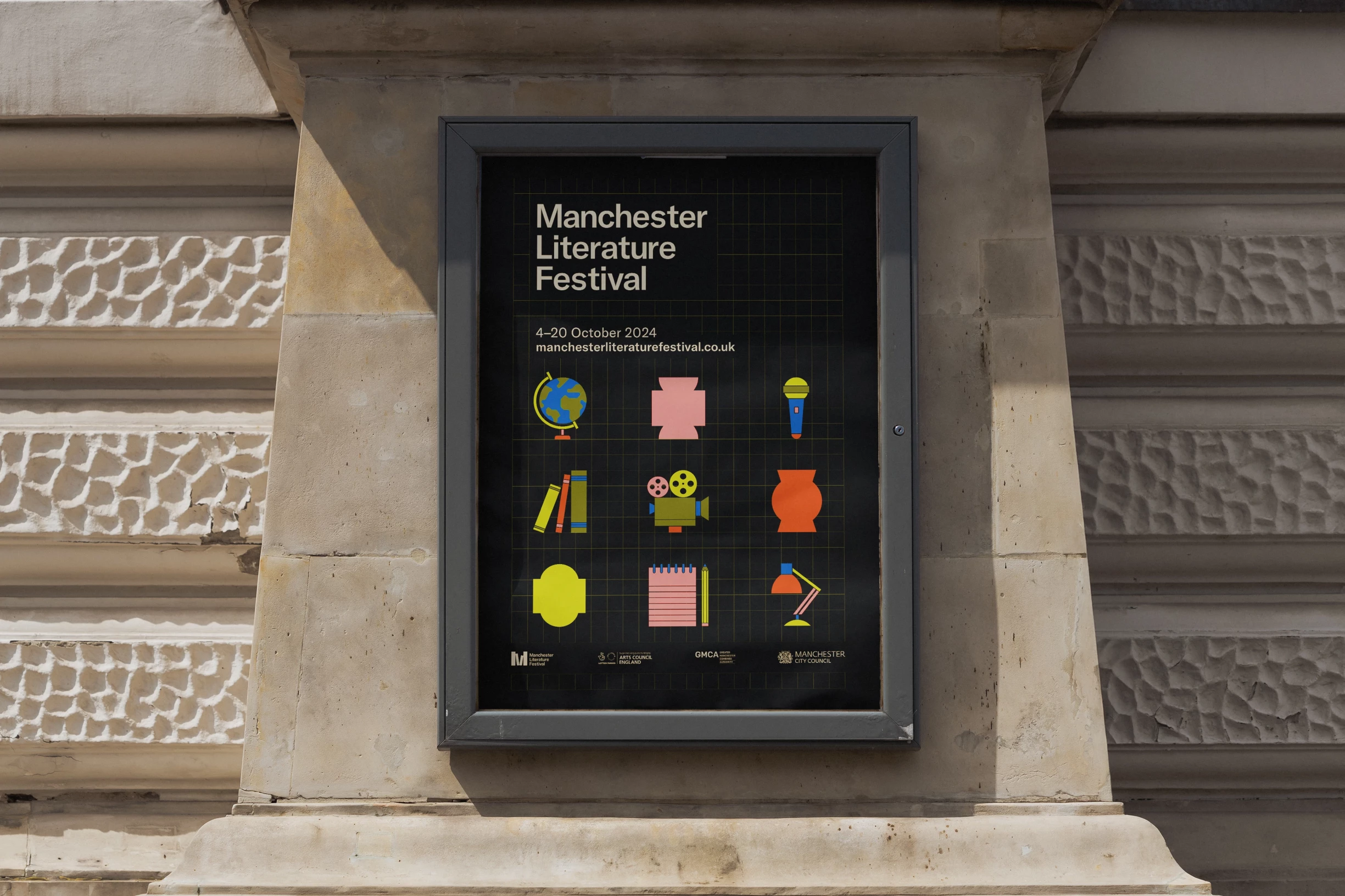 Meanwhile flyers, leaflets, and event pull-up banners brought the icons to life in public spaces, fostering a tangible connection with Manchester Literature Festival’s communities. An exciting component of this physical suite of assets, was the design of out of home advertising, which magnified the visual all across Manchester city centre. The striking out of home created an immersive presence and drew attention to the Manchester Literature Festival’s new identity in a busy urban environment, on an attention-grabbing scale.